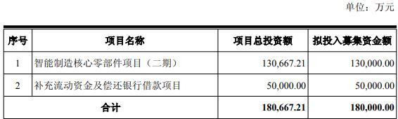 本次发行的募集资金总额不超过180,000.00万元(含),扣除发行费用后募集资金净额拟用于智能制造核心零部件项目(二期)、补充流动资金及偿还银行借款项目。