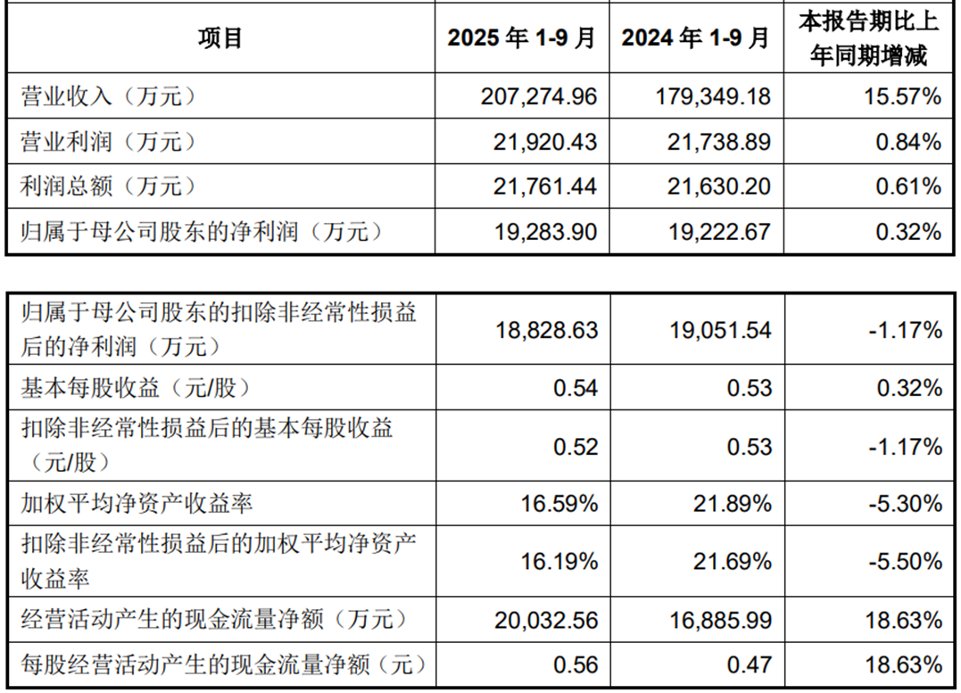 2025年1-9月,大明电子实现营业收入207,274.96万元,同比增长15.57%;归属于母公司股东的净利润为19,283.90万元,同比增长0.32%;归属于母公司股东的扣除非经常性损益后的净利润18,828.63万元,同比下降1.17%;经营活动产生的现金流量净额为20,032.56万元,同比增长18.63%。