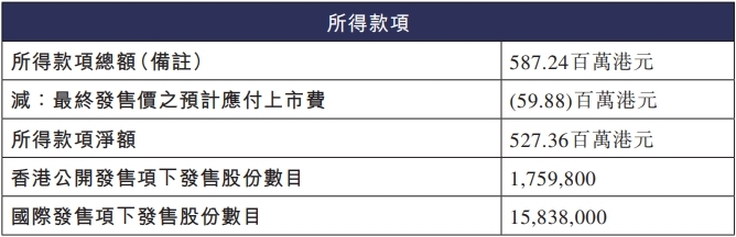 旺山旺水本次发行的最终发售价为33.370港元,所得款项总额为587.24百万港元,扣除最终发售价之预计应付上市费59.88百万港元后,所得款项净额为527.36百万港元。