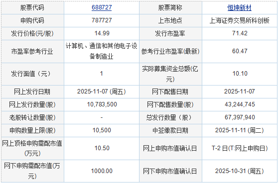 恒坤新材2025年10月30日披露的首次公开发行股票并在科创板上市招股意向书显示,公司拟募集资金100,669.50万元,用于集成电路前驱体二期项目、集成电路用先进材料项目。
