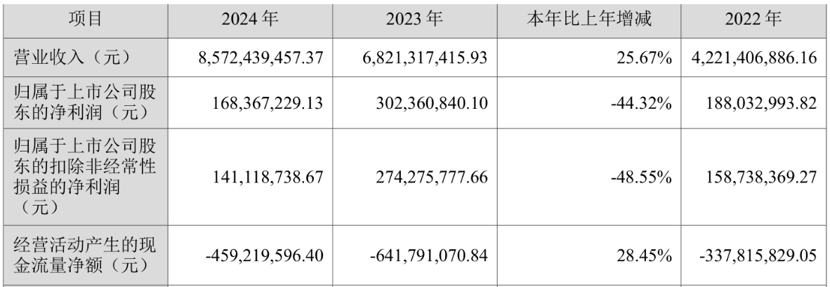 2024年,公司实现营业收入85.72亿元,同比增长25.67%;归属于上市公司股东的净利润1.68亿元,同比下降44.32%;归属于上市公司股东的扣非净利润1.41亿元,同比下降48.55%;经营活动产生的现金流量净额为-4.59亿元,上年同期为-6.42亿元。