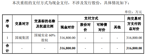 国城矿业11月8日披露的重大资产购买暨关联交易报告书(草案)显示,本次交易中,上市公司拟通过支付现金方式购买国城集团持有的国城实业60.00%的股权。本次交易完成后,国城实业将成为上市公司的控股子公司。