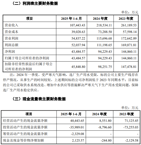 标的公司2024年营收同比下降16.33%,净利润同比下降34.95%,扣除非经常性损益后归属于母公司所有者的净利润同比下降33.38%。2023年度、2024年度、2025年上半年,标的公司营业收入分别为261,189.53万元、218,534.11万元、107,443.43万元,净利润/归属于母公司所有者的净利润分别为144,860.11万元、94,229.43万元、43,484.57万元,扣除非经常性损益后归属于母公司所有者的净利润分别为147,478.81万元、98,251.75万元、45,848.80万元;经营活动产生的现金流量净额分别为71,125.45万元、8,551.80万元、40,443.65万元。
