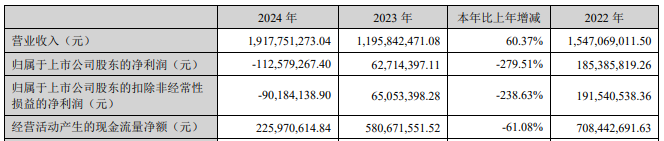 2024年,国城矿业实现营业收入19.18亿元,同比增长60.37%;归属于上市公司股东的净利润-1.13亿元,上年同期为0.63亿元;归属于上市公司股东的扣除非经常性损益的净利润-0.90亿元,上年同期为0.65亿元;经营活动产生的现金流量净额2.26亿元,同比下降61.08%。