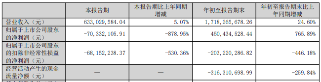 第三季度,国城矿业实现营业收入6.33亿元,同比增长5.07%;归属于上市公司股东的净利润-0.70亿元;归属于上市公司股东的扣除非经常性损益的净利润-0.68亿元。
