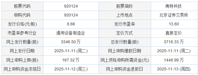 南特科技2025年11月7日披露的向不特定合格投资者公开发行股票并在北京证券交易所上市发行公告显示,若本次发行成功,预计公司募集资金总额为32,200.76万元,扣除发行费用3,758.25万元(不含增值税)后,预计募集资金净额为28,442.52万元。