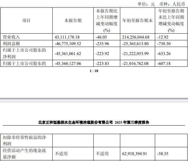 中国经济网北京11月11日讯 正和生态(605069.SH)10月30日晚披露2025年第三季度报告,本报告期,公司实现营业收入4311.12万元,同比减少46.05%;归属于上市公司股东的净利润-4536.11万元;归属于上市公司股东的扣除非经常性损益的净利润为-4536.01万元。