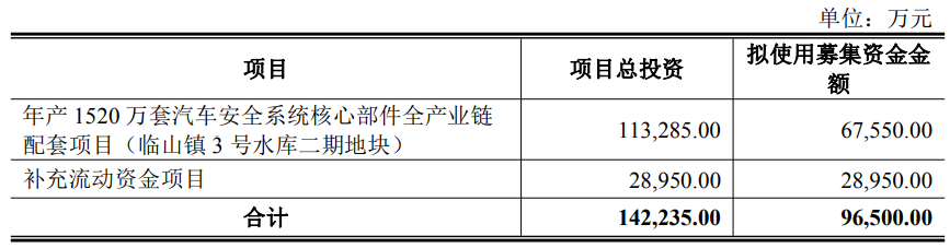 公司本次发行拟募集资金总额不超过96,500.00万元(含本数),扣除发行费用后的募集资金净额拟用于年产1520万套汽车安全系统核心部件全产业链配套项目(临山镇3号水库二期地块)、补充流动资金项目。
