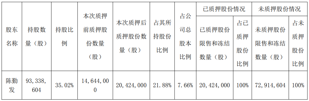 名臣健康11月7日披露关于控股股东部分股份质押的公告显示,截至公告披露日,陈勤发持有公司93,338,604股股份,占公司总股本的35.02%,其中累计质押的股份数为20,424,000股,占其持有公司股份总数的21.88%,占公司总股本的7.66%。