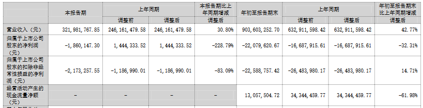 2025年1-9月,公司实现营业收入9.04亿元,同比增长42.77%;归属于上市公司股东的净利润为-2,207.96万元,上年同期为-1,668.79万元;归属于上市公司股东的扣除非经常性损益的净利润为-2,258.88万元,上年同期为-2,648.40万元;经营活动产生的现金流量净额为1,305.75万元,同比下降61.98%。