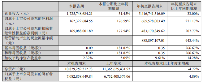 2024年前三季度,公司实现营业收入54.17亿元,同比增长33.00%;归属于上市公司股东的净利润6.66亿元,同比增长271.17%;归属于上市公司股东的扣除非经常性损益的净利润4.83亿元,同比增长207.77%;经营活动产生的现金流量净额为8.89亿元。