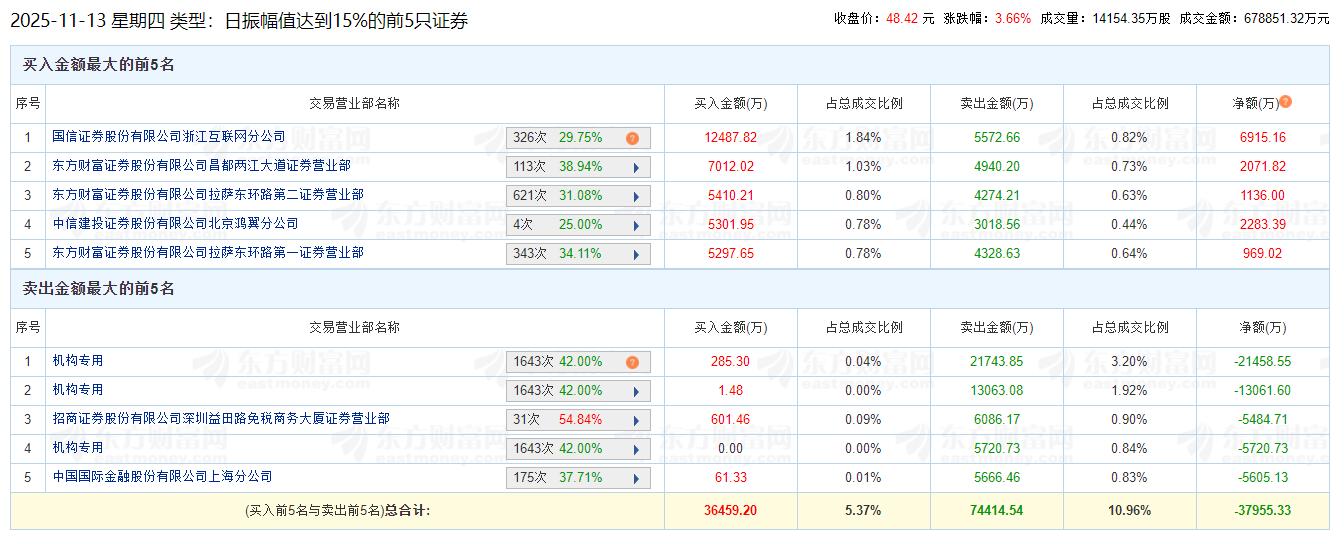 龙虎榜数据显示,天际股份为日振幅值达到15%的前5只证券,卖出该股金额最大的前5名中,3家为机构专用席位。经统计,机构席位今日卖出天际股份净额为40240.88万元。
