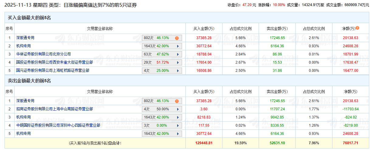 中国经济网北京11月13日讯 天赐材料(002709.SZ)今日涨停,收报47.20元,涨幅10.00%。