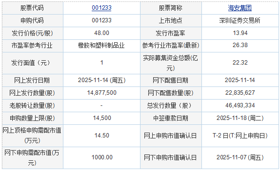海安集团2025年11月13日披露的首次公开发行股票并在主板上市发行公告显示,按本次发行价格48.00元/股和4,649.3334万股的新股发行数量计算,若本次发行成功,预计公司募集资金总额约为223,168.00万元,扣除预计发行费用约12,415.11万元(不含增值税)后,预计募集资金净额约为210,752.89万元。