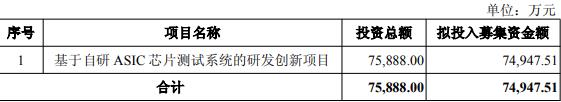 本次发行可转债募集资金总额(含发行费用)不超过人民币74,947.51万元(含),扣除发行费用后的募集资金净额将用于基于自研ASIC芯片测试系统的研发创新项目。