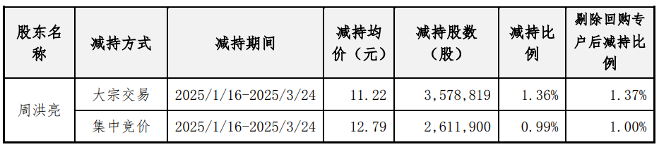 持有公司1,892.16万股的股东周洪军(占公司总股本的6.04%),因股东归还个人债务需要,拟于公告披露之日起15个交易日后的3个月内(即2025年12月5日至2026年3月4日),通过大宗交易和集中竞价方式减持公司股份不超过940.29万股,即不超过公司总股本的3%。
