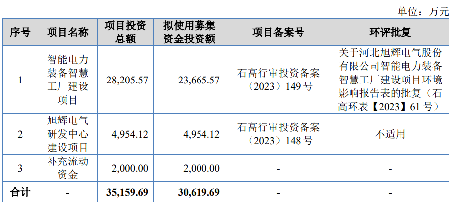 旭辉电气原拟募集资金30,619.69万元,用于智能电力装备智慧工厂建设项目、旭辉电气研发中心建设项目、补充流动资金。