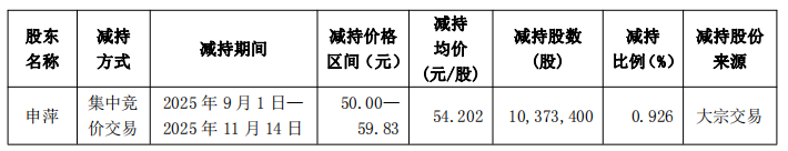 近日,公司收到申萍出具的《关于股份减持计划实施完成的告知函》。2025年9月1日至2025年11月14日,申萍通过集中竞价交易方式减持公司10,373,400股股份,减持价格区间为50.00元至59.83元,减持均价为54.202元/股,减持比例为0.926%。
