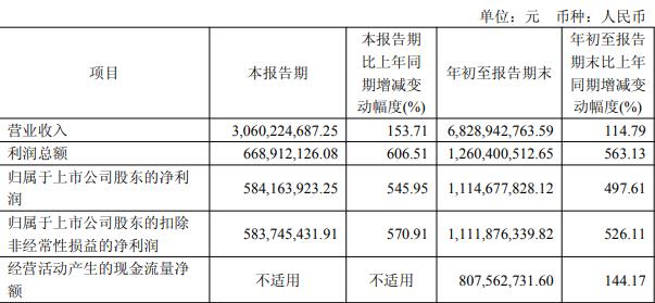 年初至报告期末,公司实现营业收入68.29亿元,同比增长114.79%;归属于上市公司股东的净利润11.15亿元,同比增长497.61%;扣除非经常性损益后的净利润11.12亿元,同比增长526.11%;经营活动产生的现金流量净额8.08亿元,同比增长144.17%。