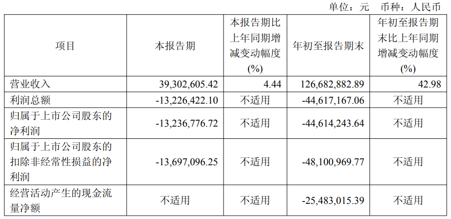 2025年前三季度,公司实现营业收入1.27亿元,同比增长42.98%;归属于上市公司股东的净利润为-4461.42万元,上年同期为-3270.88万元;归属于上市公司股东的扣非净利润为-4810.1万元,上年同期为-3569.67万元;经营活动产生的现金流量净额为-2548.3万元,上年同期为-6631.47万元。