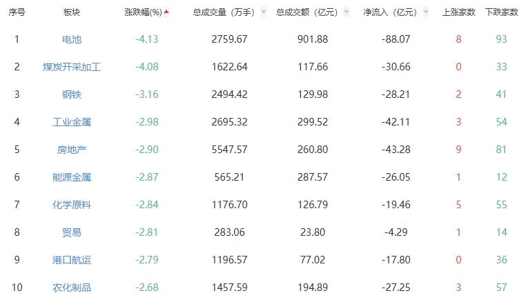 板块方面,互联网电商、文化传媒、厨卫电器、IT服务等涨幅居前,电池、煤炭开采加工、钢铁、工业金属等跌幅居前。