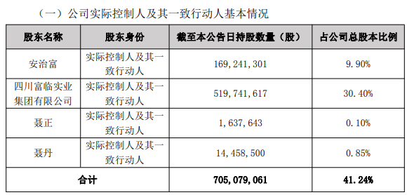 安治富及其及其一致行动人目前持有富临精工705,079,061股,持股比例为41.24%。