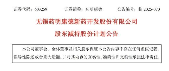 据公告,药明康德于2025年10月29日收到实际控制人控制的股东发出的《告知函》。因自身资金需求,公司实际控制人控制的股东计划根据市场情况自公告披露日起15个交易日后的3个月内,通过集中竞价和/或大宗交易方式减持公司A股股份,减持股份数量不超过公司总股本的2%,即合计不超过5967.51万股。按照药明康德10月29日收盘价106.04元/股计算,此次减持金额约为63亿元。