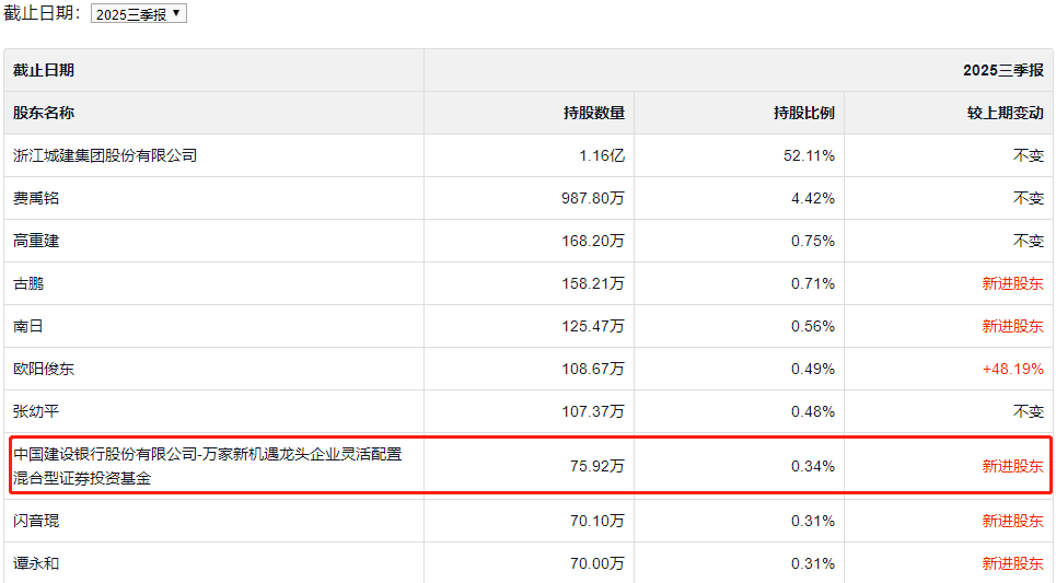汉嘉设计今年三季报显示,万家新机遇龙头企业灵活混合基金于三季度新进买入75.92万股公司股份,并位居第八大流通股东,持股占比0.34%。