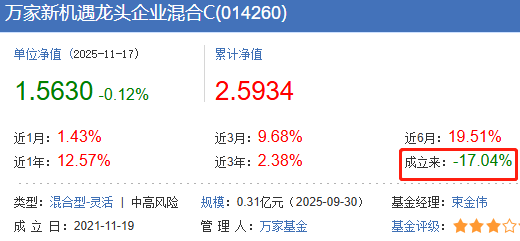 而从天天基金网获悉,万家新机遇龙头企业混合A/C分别成立于2018年5月25日和2021年11月19日,截至2025年11月17日,今年以来两份额仅上涨了17.32%和16.44%,远远跑输23.34%的同类均值水平,其C份额更是累计下跌了17.04%。