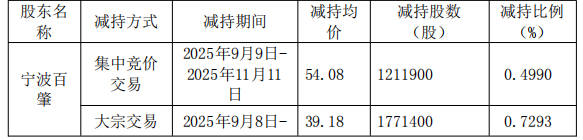 宁波百肇在减持期间通过集中竞价交易及大宗交易合计减持公司股份298.33万股,占总股本1.2283%。其中,集中竞价交易于2025年9月9日至11月11日进行,减持均价54.08元/股,减持数量121.19万股,占总股本0.4990%;大宗交易于2025年9月8日至11月11日进行,减持均价39.18元/股,减持数量177.14万股,占总股本0.7293%。