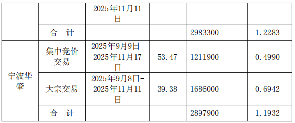 宁波华肇在减持期间通过集中竞价交易及大宗交易合计减持289.79万股,占总股本1.1932%。其通过集中竞价交易于2025年9月9日至11月17日减持121.19万股,减持均价53.47元/股,占总股本0.4990%;通过大宗交易于2025年9月8日至11月11日减持168.60万股,均价39.38元/股,占总股本0.6942%。