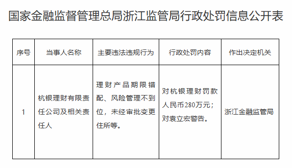 杭银理财被罚280万 涉理财产品期限错配等3宗违规