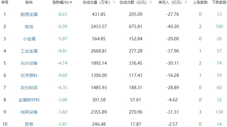 板块方面,种植业与林业板块上涨,能源金属、电池、小金属等板块跌幅居前。