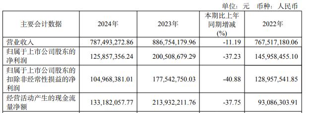 2024年,公司实现营业收入7.87亿元,同比下降11.19%;归属于上市公司股东的净利润1.26亿元,同比下降37.23%;归属于上市公司股东的扣除非经常性损益的净利润1.05亿元,同比下降40.88%;经营活动产生的现金流量净额为1.33亿元,同比下降37.75%。