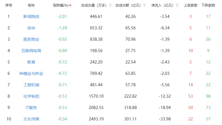 板块方面,消费电子、黑色家电、电池等板块涨幅居前,影视院线、综合、医药商业等板块跌幅居前。