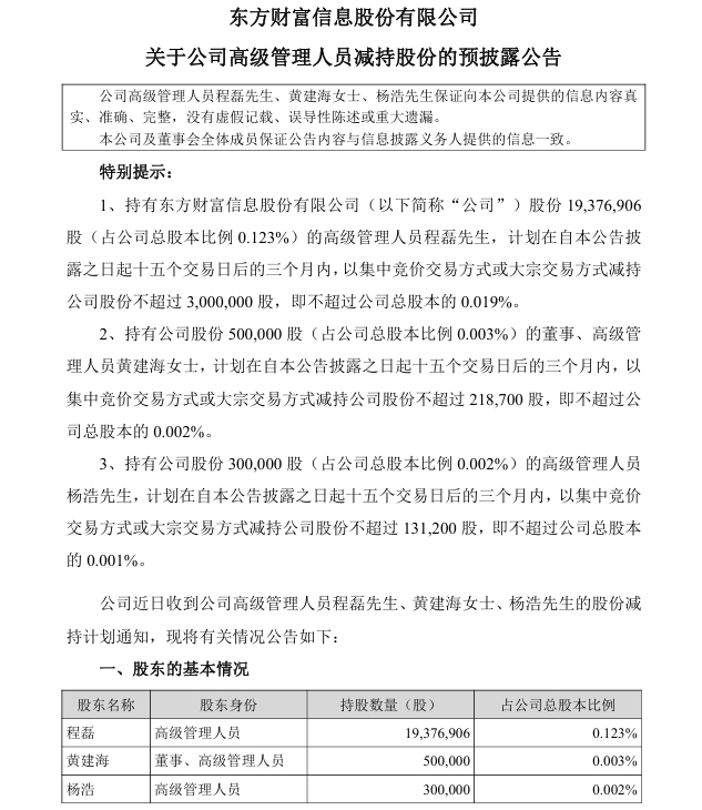 东方财富3名高管本次合计减持数量不超过334.99万股,占公司总股本比例约0.022%。