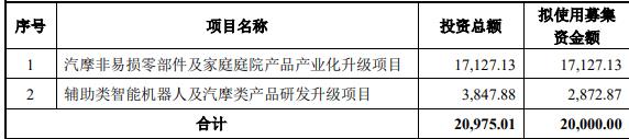 本次发行募集资金总额不超过20,000.00万元(含本数),扣除发行费用后拟将募集资金全部用于汽摩非易损零部件及家庭庭院产品产业化升级项目、辅助类智能机器人及汽摩类产品研发升级项目。