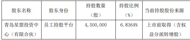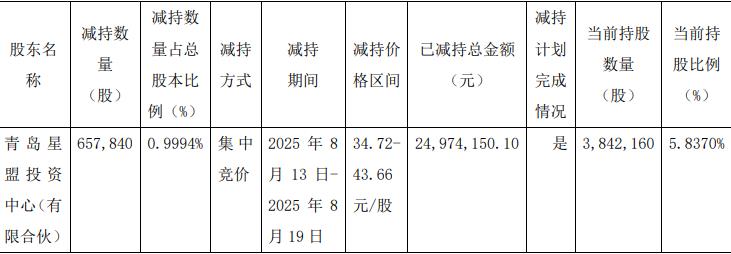公司8月20日披露员工持股平台减持股份结果公告,员工持股平台青岛星盟投资中心(有限合伙)2025年8月13日2025年8月19日以集中竞价方式减持657,840股,减持数量占总股本比例0.9994%,减持价格区间34.72至43.66元/股,已减持总金额24,974,150.10元。
