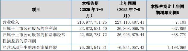 据公司2025年第三季度报告,本报告期,公司实现营业收入2.11亿元,同比减少7.10%;归属于上市公司股东的净利润2287.39万元,同比减少37.86%;扣除非经常性损益后的净利润2260.88万元,同比减少38.77%,经营活动产生的现金流量净额7636.19万元,同比增长1198.09%。