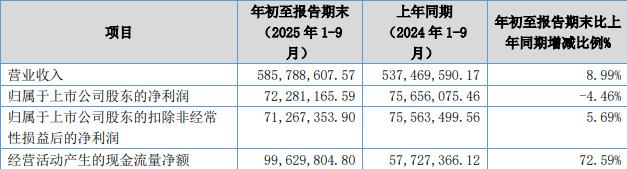 年初至报告期末,公司实现营业收入5.86亿元,同比增长8.99%;归属于上市公司股东的净利润7228.12万元,同比减少4.46%;扣除非经常性损益后的净利润7126.74万元,同比增长5.69%,经营活动产生的现金流量净额9962.98万元,同比增长72.59%。