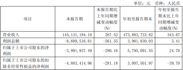 今年前三季度,鑫源智造实现营业收入4.74亿元,同比增长343.67%;归属于上市公司股东的净利润579.51万元,同比增长24.76%;归属于上市公司股东的扣除非经常性损益的净利润300.75万元,同比减少39.70%;经营活动产生的现金流量净额5964.19万元。
