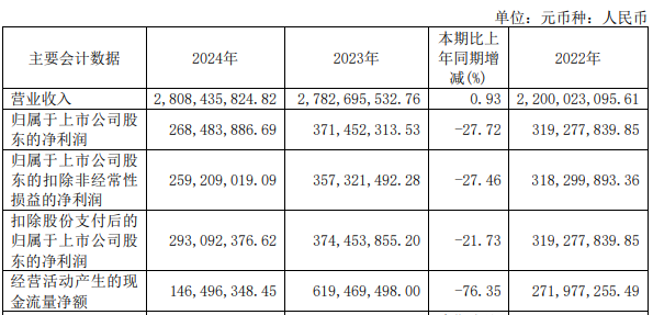 2024年,华康股份实现营业收入28.08亿元,同比增长0.93%;归属于上市公司股东的净利润2.68亿元,同比减少27.72%;归属于上市公司股东的扣除非经常性损益的净利润2.59亿元,同比减少27.46%;经营活动产生的现金流量净额为1.46亿元,同比减少76.35%。