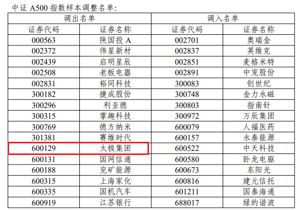 中证A500指数样本调整名单显示,太极集团(600129.SH)为中证A500指数样本调出样本之一。