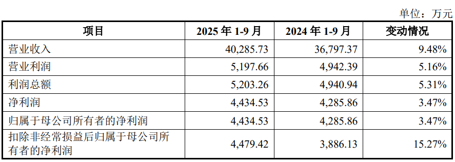 2025年1-9月,公司营业收入为40,285.73万元,同比增长9.48%;净利润/归属于母公司股东的净利润为4,434.53万元,同比增长3.47%;扣除非经常损益后归属于母公司所有者的净利润为4,479.42万元,同比增长15.27%。