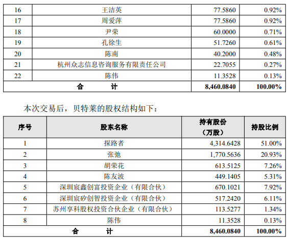 探路者拟与张弛、陈友波、胡荣花(简称“贝特莱创始人”)签署《关于深圳贝特莱电子科技股份有限公司之股份转让协议》(简称“《股份转让协议》(一)”)及《表决权委托协议》,公司拟以自有资金8,143.5405万元收购贝特莱创始人持有的贝特莱18.35%的股份,受限于《中华人民共和国公司法》及贝特莱《公司章程》的规定,贝特莱创始人拟于首期交割日(支付首付款当日)完成其合计所持目标公司12.96%股份的转让,剩余部分(对应贝特莱5.39%的股份)拟于2026年1月31日前完成交割。自《表决权委托协议》生效之日起至所有股份根据《股份转让协议》(一)约定全部交割完成之日止,贝特莱创始人将其合计持有的目标公司5.39%股份的表决权委托给公司行使。公司与深圳南山鸿泰股权投资基金合伙企业(有限合伙)、深圳市投控资本有限公司、杭州泽财杭实安芯众城半导体股权投资基金合伙企业(有限合伙)、蓉创(淄博)股权投资合伙企业(有限合伙)、杭州众志信息咨询服务有限责任公司、9名自然人股东(合称“投资人”)及深圳宸芯秋实企业管理咨询合伙企业(有限合伙)(简称“贝特莱持股平台”)拟签署《关于深圳贝特莱电子科技股份有限公司之股份转让协议》(简称“《股份转让协议》(二)”),拟以自有资金23,986.4595万元收购投资人股东及贝特莱持股平台持有的贝特莱32.65%的股份。根据《股份转让协议》(一)(二),公司合计拟以自有资金32,130万元收购贝特莱51%的股份,《股份转让协议》(一)已就贝特莱其他股东放弃本次股份转让的优先受让权作出安排。贝特莱将成为公司的控股子公司,纳入公司合并报表范围。