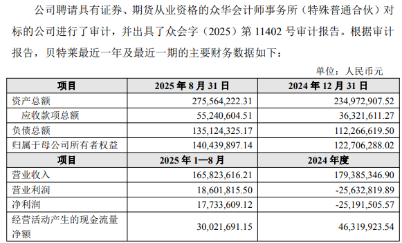2024年度、2025年1至8月,贝特莱营业收入分别为1.79亿元、1.66亿元,净利润分别为-2519.15万元、1773.36万元。