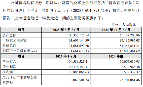 2024年度、2025年1至8月,上海通途营业收入分别为5605.70万元、1.05亿元,净利润分别为553.93万元、1888.61万元,经营活动产生的现金流量净额分别为-370.11万元、906.05万元。