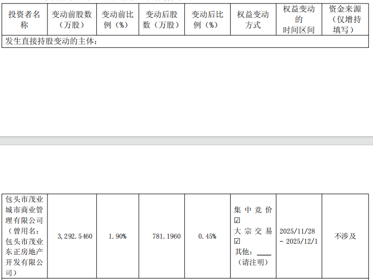 本次权益变动前,包头茂业商管及其一致行动人合计持有公司股份1,497,380,497股,占公司总股本的86.45%;权益变动后,包头茂业商管及其一致行动人合计持有公司股份1,472,266,997股,占公司总股本的85.00%。权益变动触及1%及5%的整数倍。
