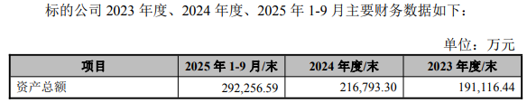 2023年末、2024年末、2025年9月末,标的公司资产总额分别为191,116.44万元、216,793.30万元、292,256.59万元,负债总额分别为130,313.66万元、143,061.78万元、202,518.03万元。据此计算,标的公司各期末资产负债率分别为68.19%、65.99%、69.29%。