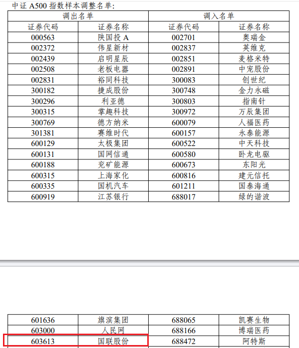 中证A500指数样本调整名单显示,国联股份(603613.SH)为中证A500指数样本调出样本之一。